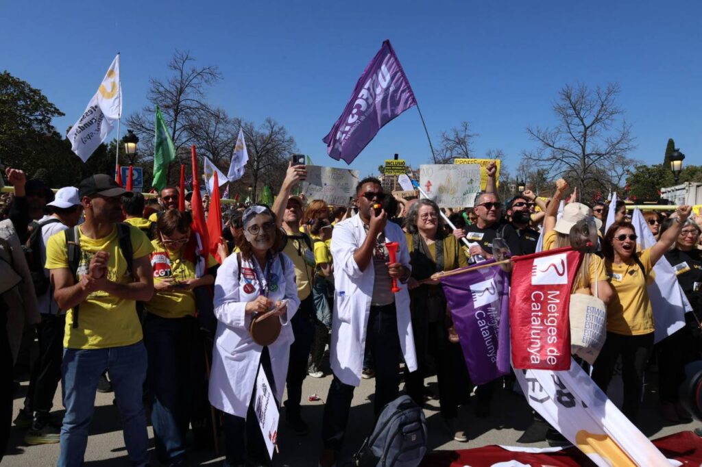 La coincidència de la vaga de sanitaris amb la de docents va propiciar mobilitzacions més familiars, i es van poder comptabilitzar més infants entre els manifestants que en d’altres convocatòries. En total, més d’un miler de metges i metgesses, segons la Guàrdia Urbana, es van adherir a la novena convocatòria del sindicat Metges de Catalunya. La manifestació es va cloure al Parc de la Ciutadella, on els professionals sanitaris van esperar l’arribada de la Marea Groga de docents que va aclaparar els carrers de Barcelona i els van rebre amb aplaudiments i complicitat. L’entrada dels docents a la Ciutadella, a pocs metres del Parlament, anava a ritme de consignes com ara “Illa, escolta, s’acosta la revolta” o “Les despeses militars, per escoles i hospitals”.